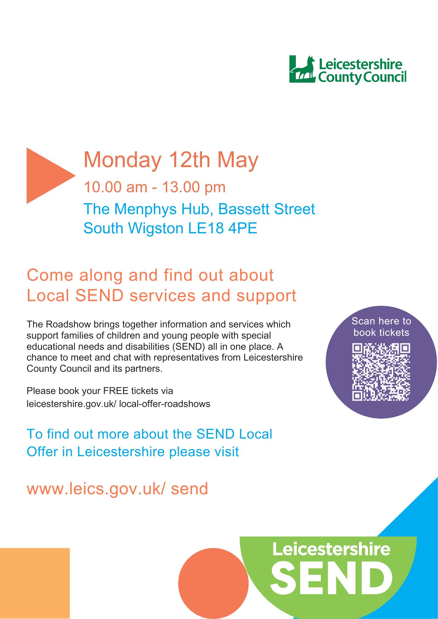 Leicestershire County Council's  Local Special Educational Needs and Disabilities (SEND) services and support are holding a roadshow on Monday 12th May, 10.00am - 13.00pm at The Menphys Hub,  South Wigston.